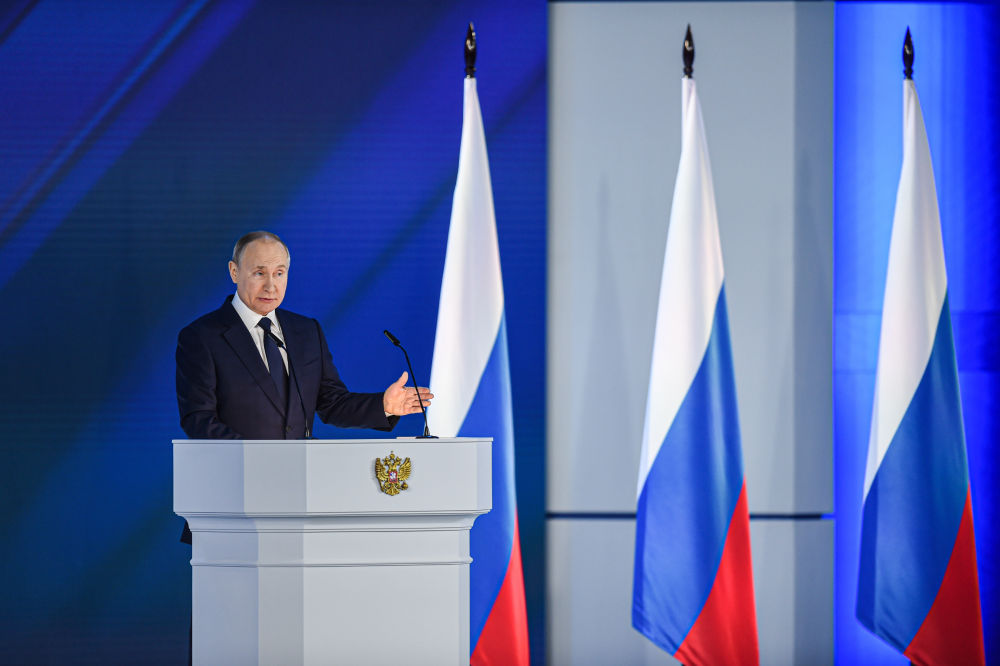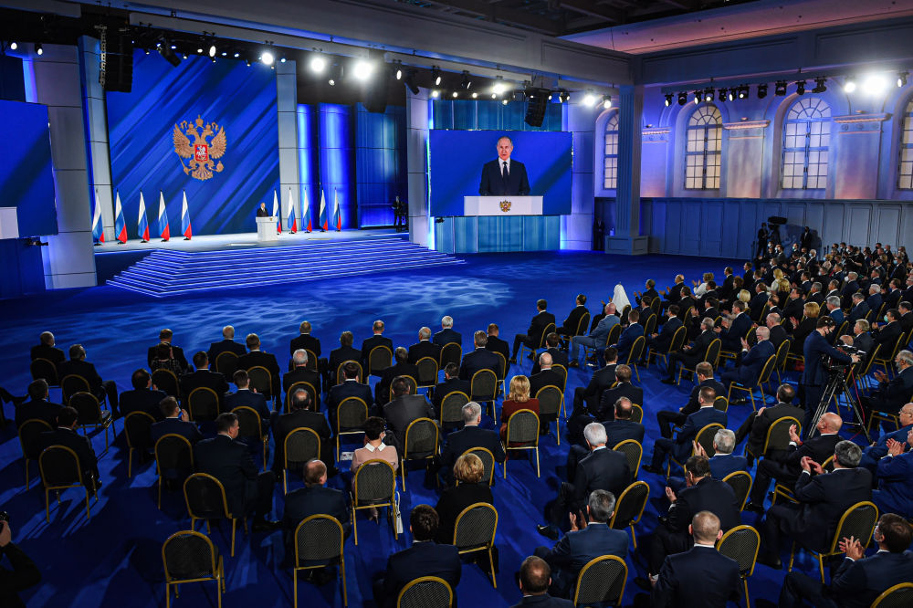 4月21日,俄罗斯总统普京在莫斯科发表国情咨文。新华社发(叶甫盖尼·西尼岑摄)