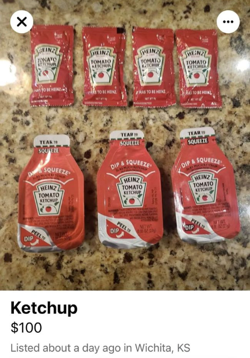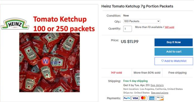 这导致美国餐厅一次性小包装番茄酱的价格上涨超过10%。在ebay上50包独立小包装亨氏番茄酱要价9.99美元,还有100包装和250包装,分别喊价11.99美元和17.29美元……交易记录显示,已经出售了近150包。