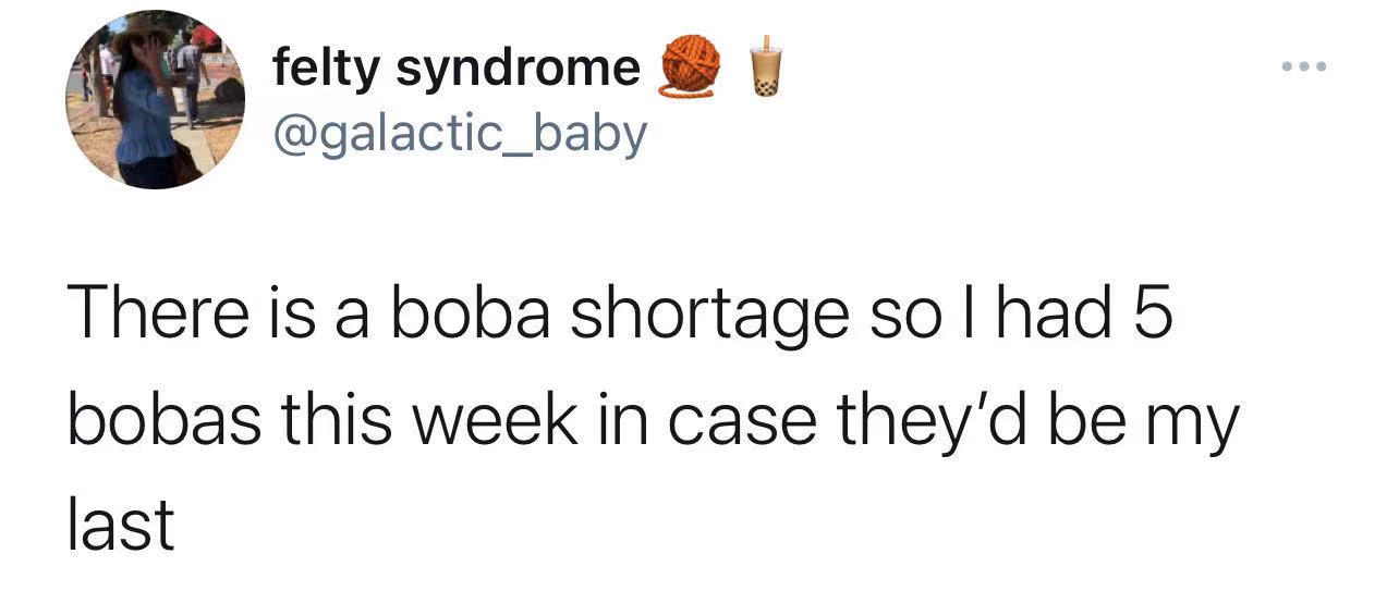 △美国网友:我妈妈听说了珍珠短缺,下班回家之后说:“我们快去!这可能是近一段时间里的最后一杯了。”