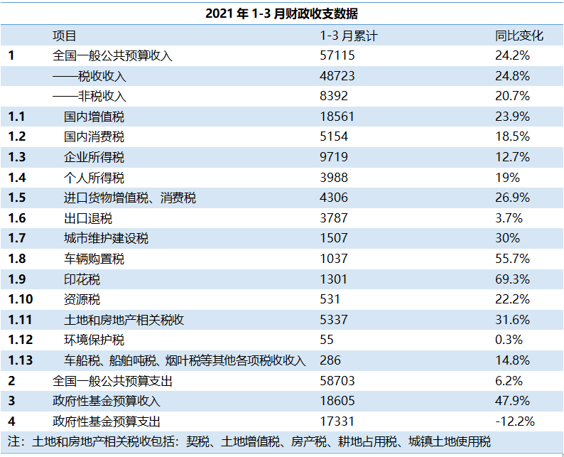 数据显示,1-3月累计,全国一般公共预算收入57115亿元,同比增长24.2%,其中,中央一般公共预算收入26902亿元,增长27.2%;地方一般公共预算本级收入30213亿元,增长21.7%。全国税收收入48723亿元,同比增长24.8%;非税收入8392亿元,同比增长20.7%。