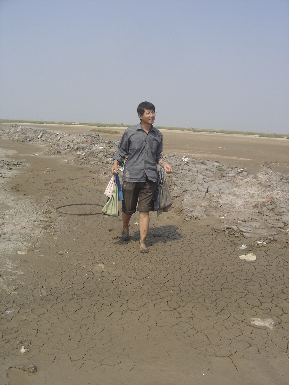 ↑2006年8月29日,孟德荣赤脚行走在沧州沿海湿地,准备为水鸟进行环志,进行鸟类科考。(受访者供图)