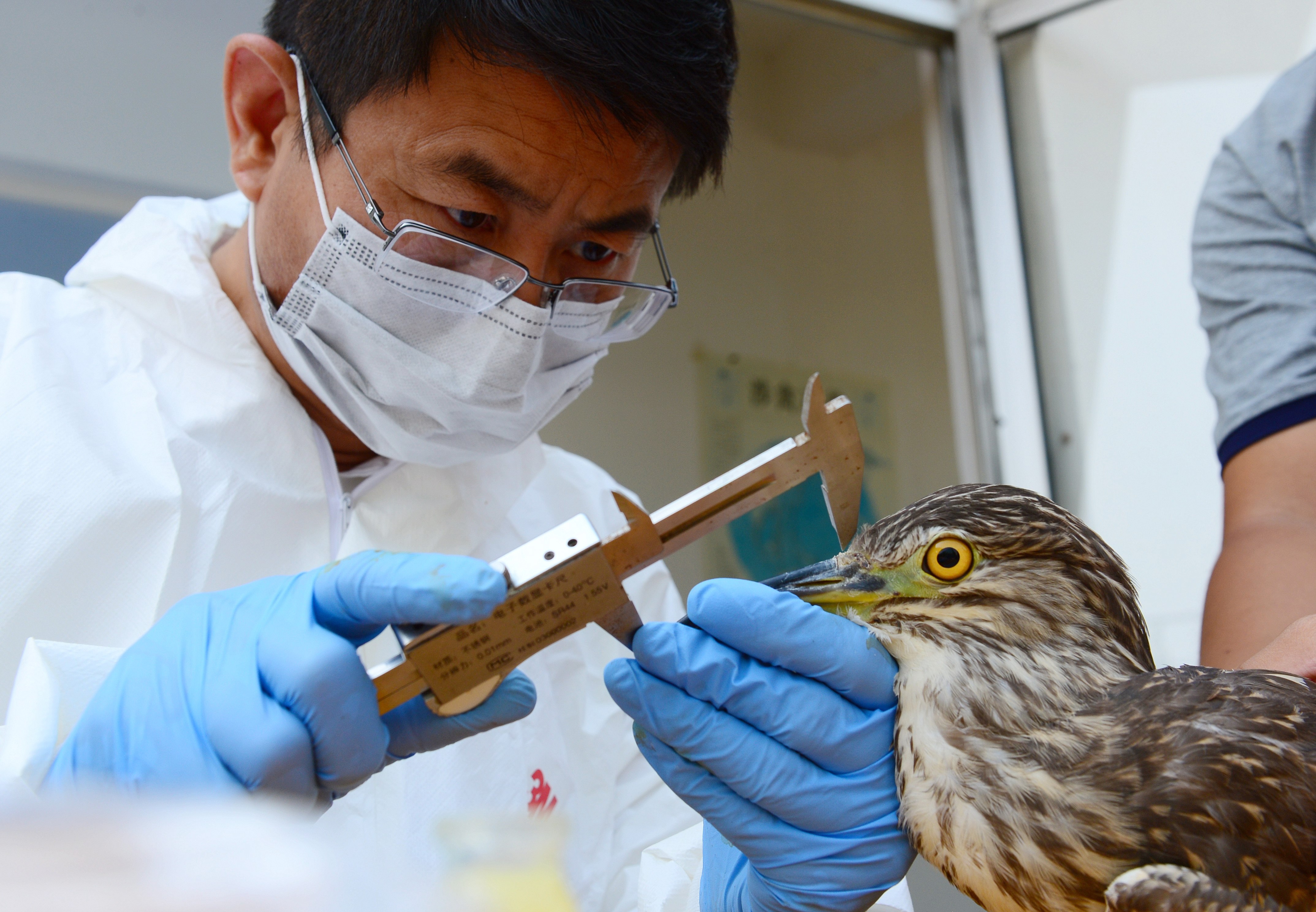 ↑2015年9月16日,孟德荣在沧州野生动物救护中心为一只即将放飞的夜鹭做外形测量。新华社记者 朱旭东 摄
