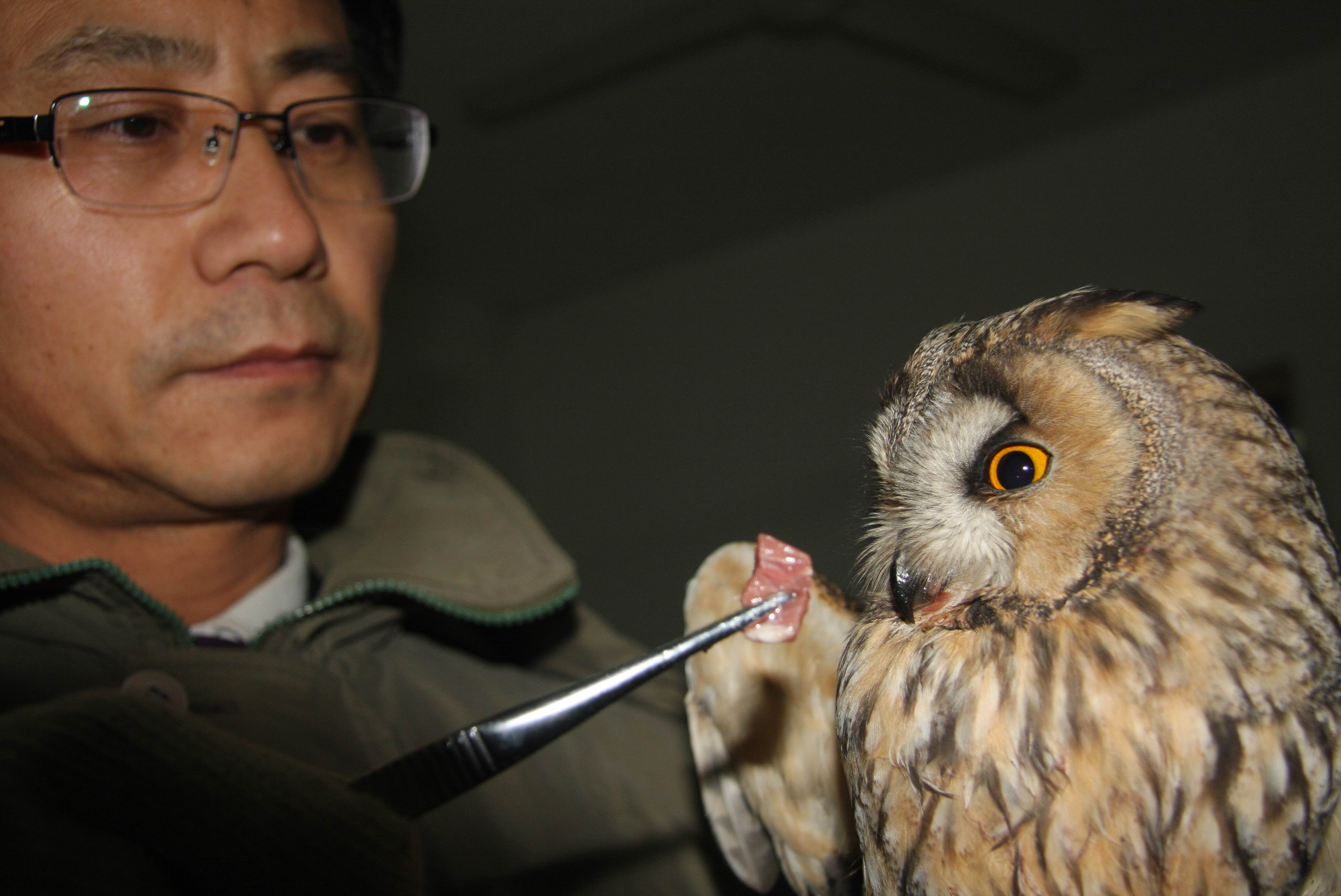↑孟德荣在给一只翅膀受伤的国家二级保护动物猫头鹰喂食(2012年4月20日摄)。新华社发(傅新春 摄)