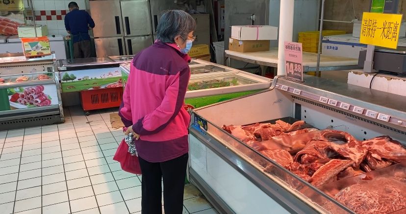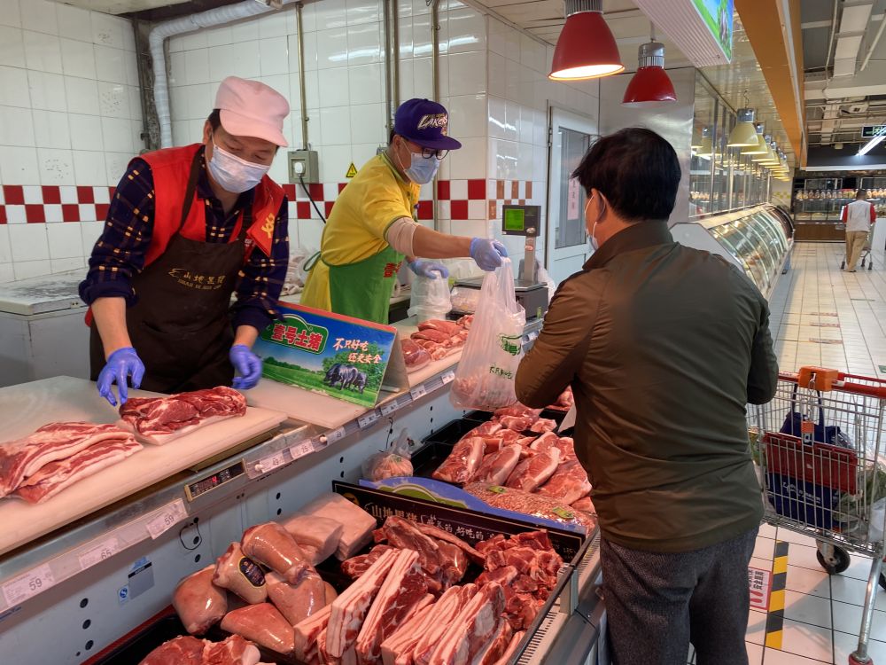 记者在北京市东城区一家大型商超二楼鲜肉专区看到,里面人头攒动,消费者选购各类猪肉产品。