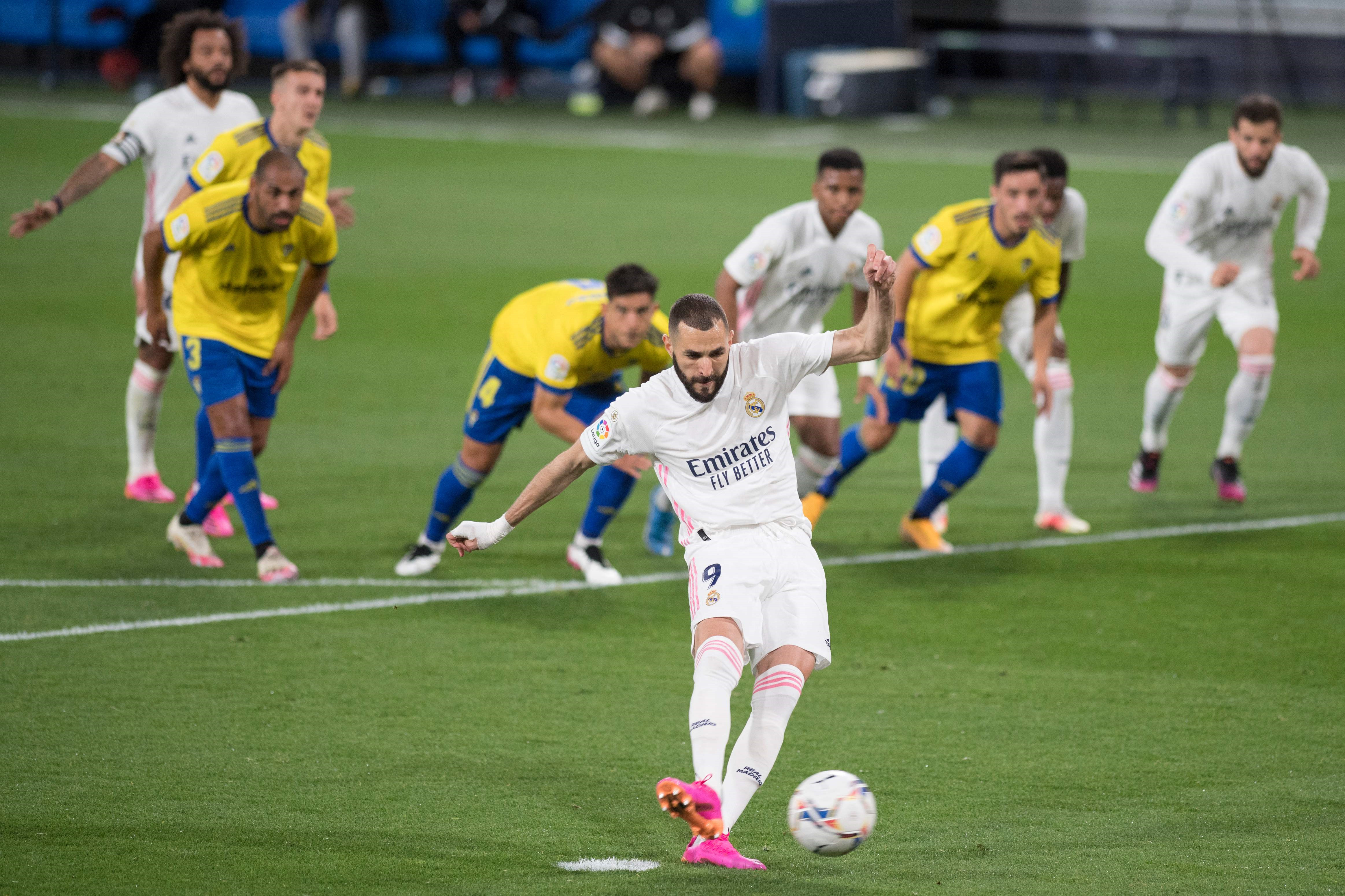 4月21日,皇家马德里队球员本泽马(前)主罚点球命中。新华社发