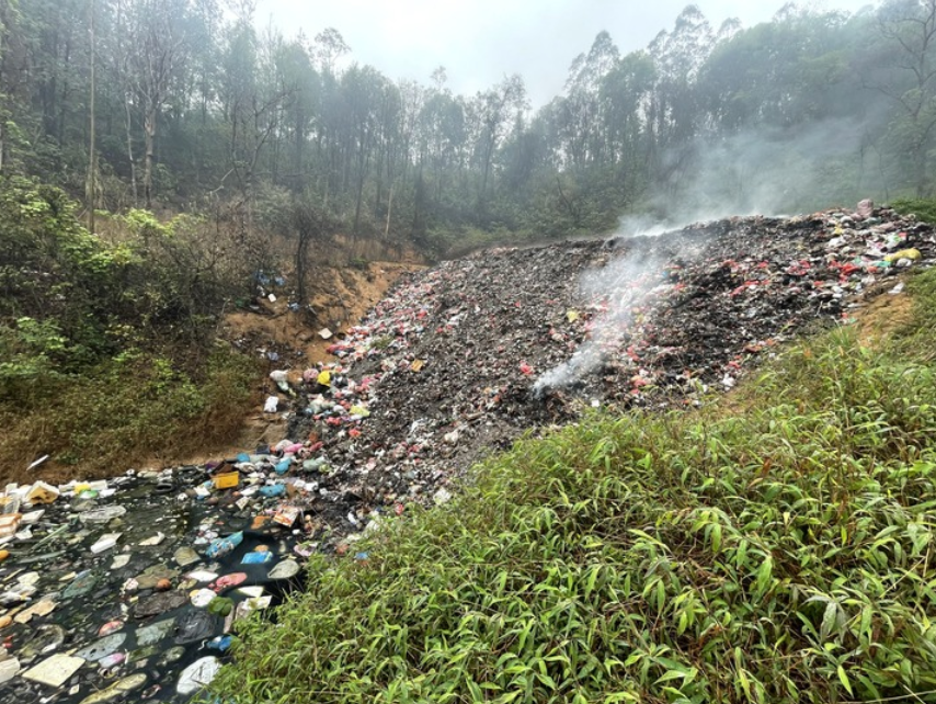 滚滚浓烟冒出,呛鼻的恶臭四溢。旁边的小山坡上,垃圾堆到了半山腰,并冒着烟,虫蝇四处飞舞。