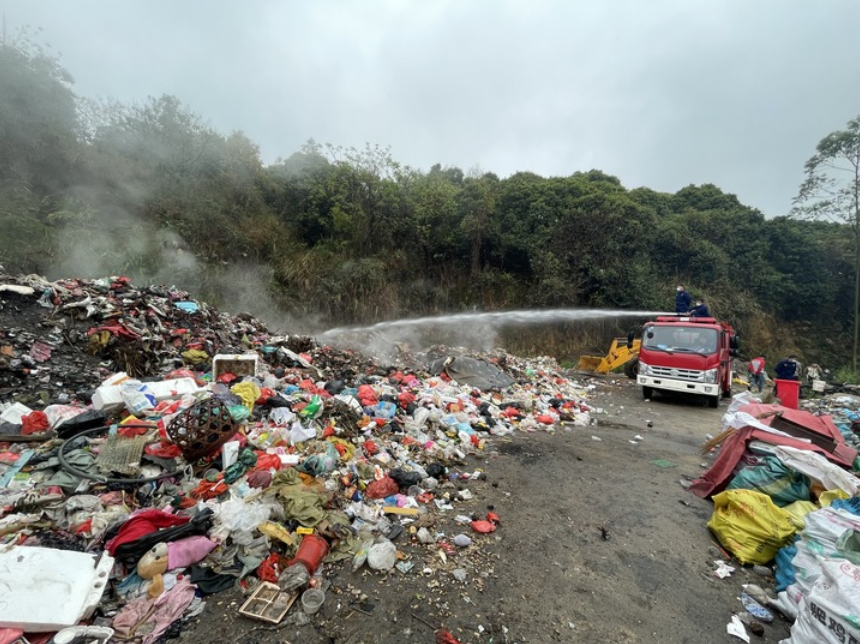 一处垃圾转运堆放点,消防人员正在处理燃着的垃圾。新华社记者 雷嘉兴 摄