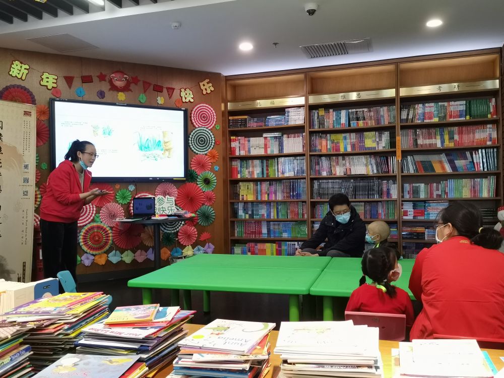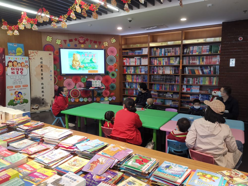 ↑外研书店的店员(左一)在给小朋友和家长们讲绘本故事。