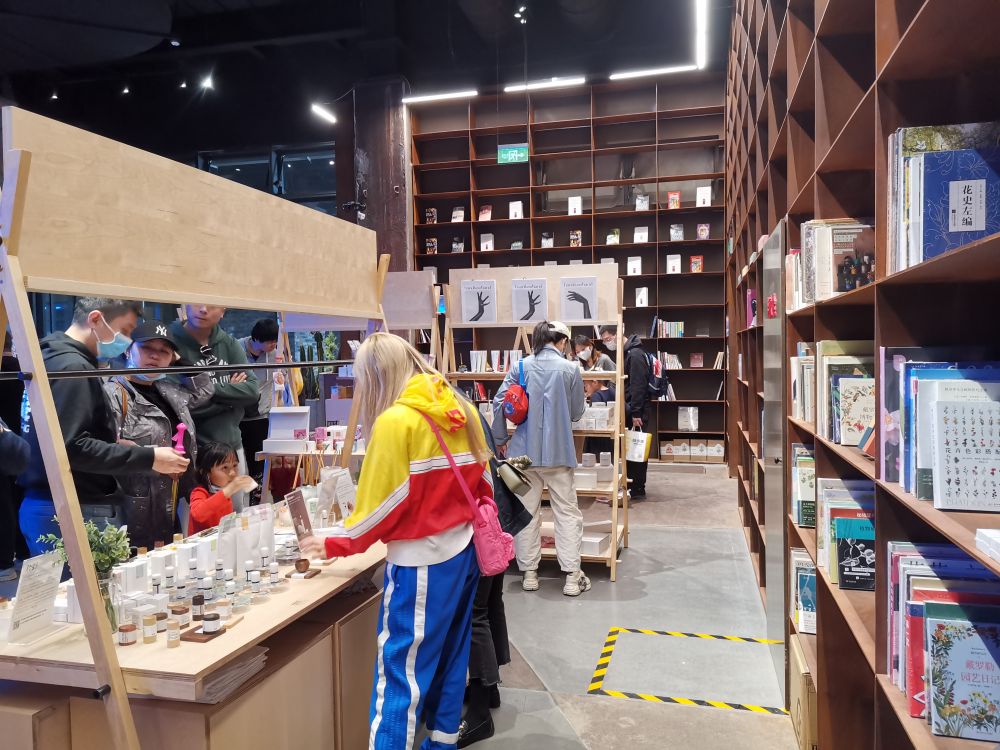 ↑全民畅读艺术书店中,文创贩售区人头攒动,一旁的书架则无人问津。