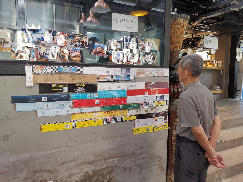 ↑全民畅读(朗园PARK店)把书的腰封作为装饰贴在墙上。
