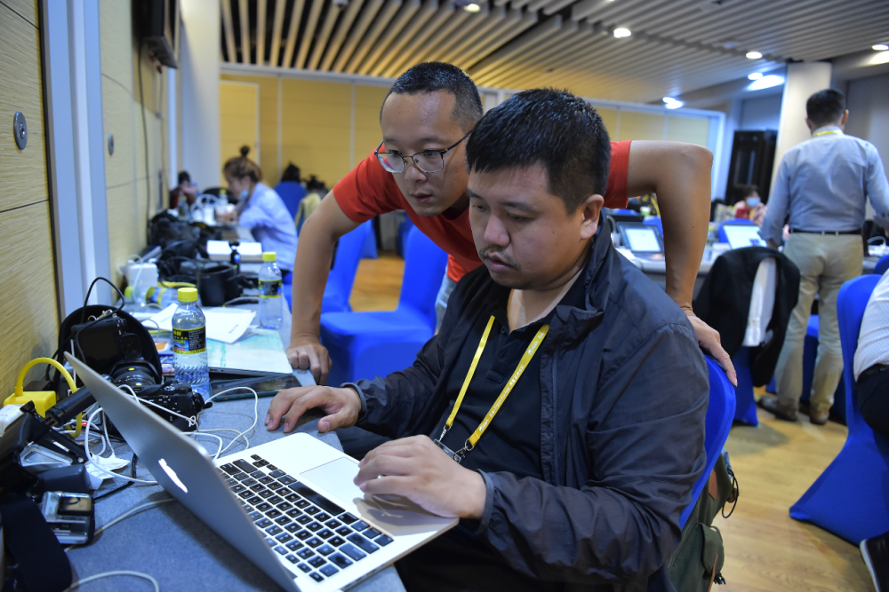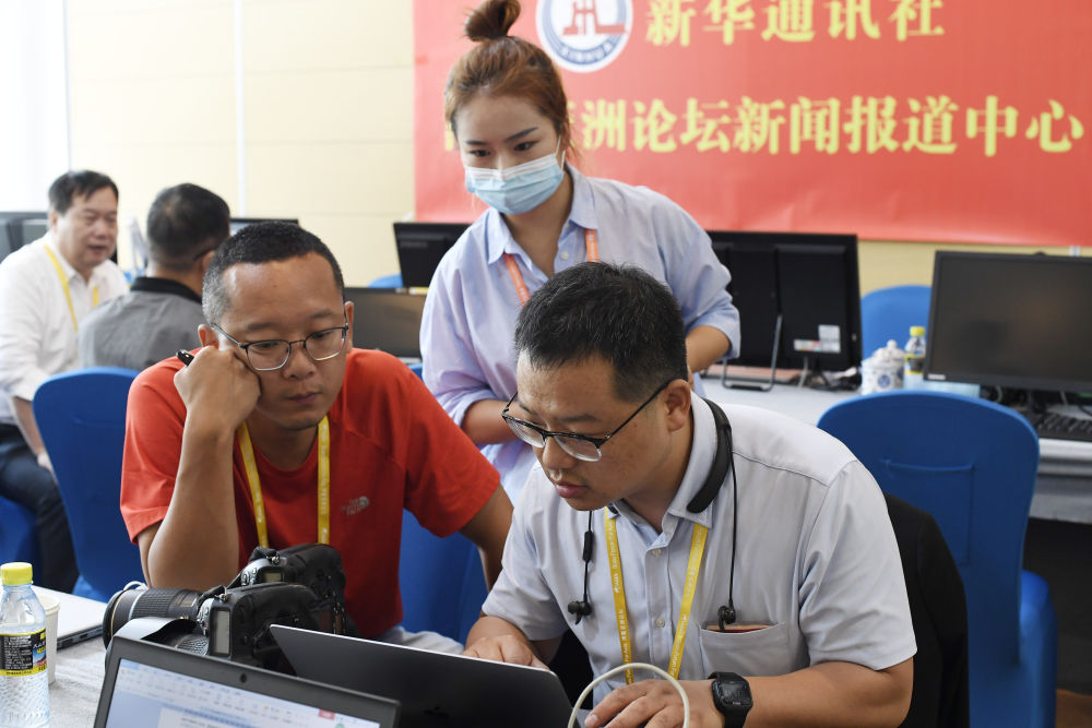 4月21日,新华社记者才扬(前),郭程(后)在新华通讯社博鳌亚洲论坛新闻报道中心研讨稿件。