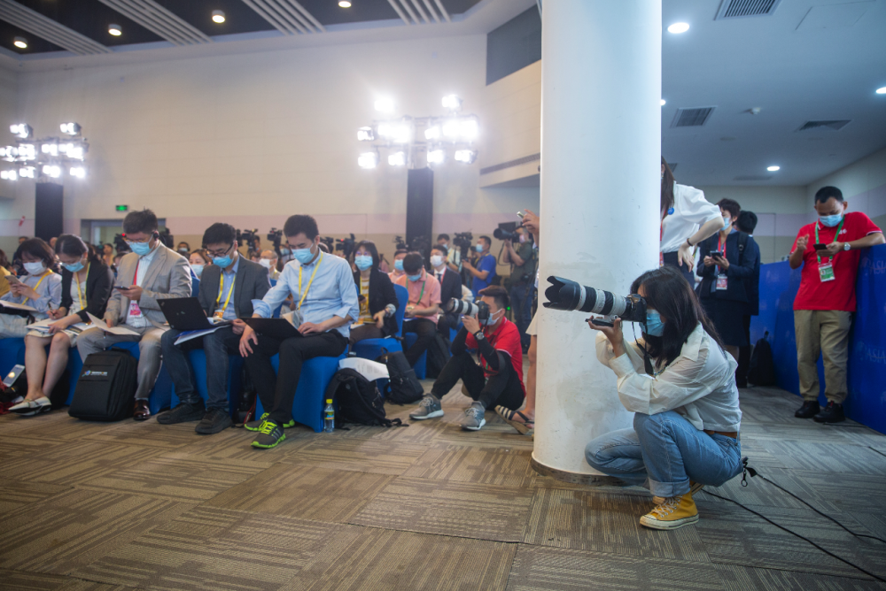 4月18日,新华社记者张丽芸在博鳌亚洲论坛新闻发布会现场拍摄。