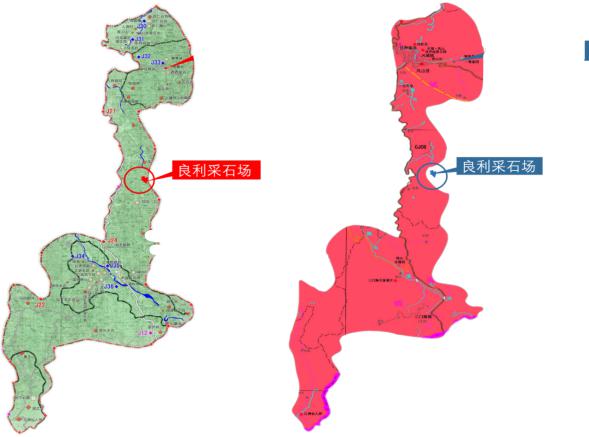 图1 左侧为2010年批复的《公园规划》中地质公园边界图,良利采石场位于边界内;右侧为2018年出台的《凤山县矿产资源总体规划(2016-2020年》附图,将良利采石场调出公园范围