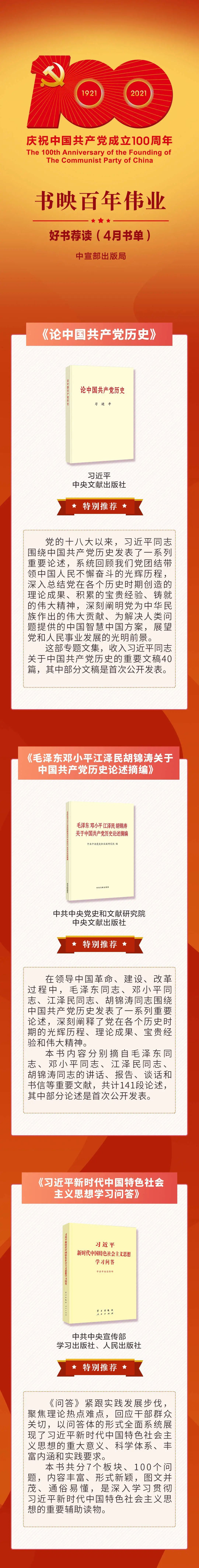 为庆祝中国共产党成立100周年,中共中央宣传部出版局联合有关单位和部门开展“书映百年伟业——庆祝中国共产党成立100周年好书荐读”活动,于2021年4月—12月,每月向全社会公布当月推荐书单。4月书单,一起来看吧~