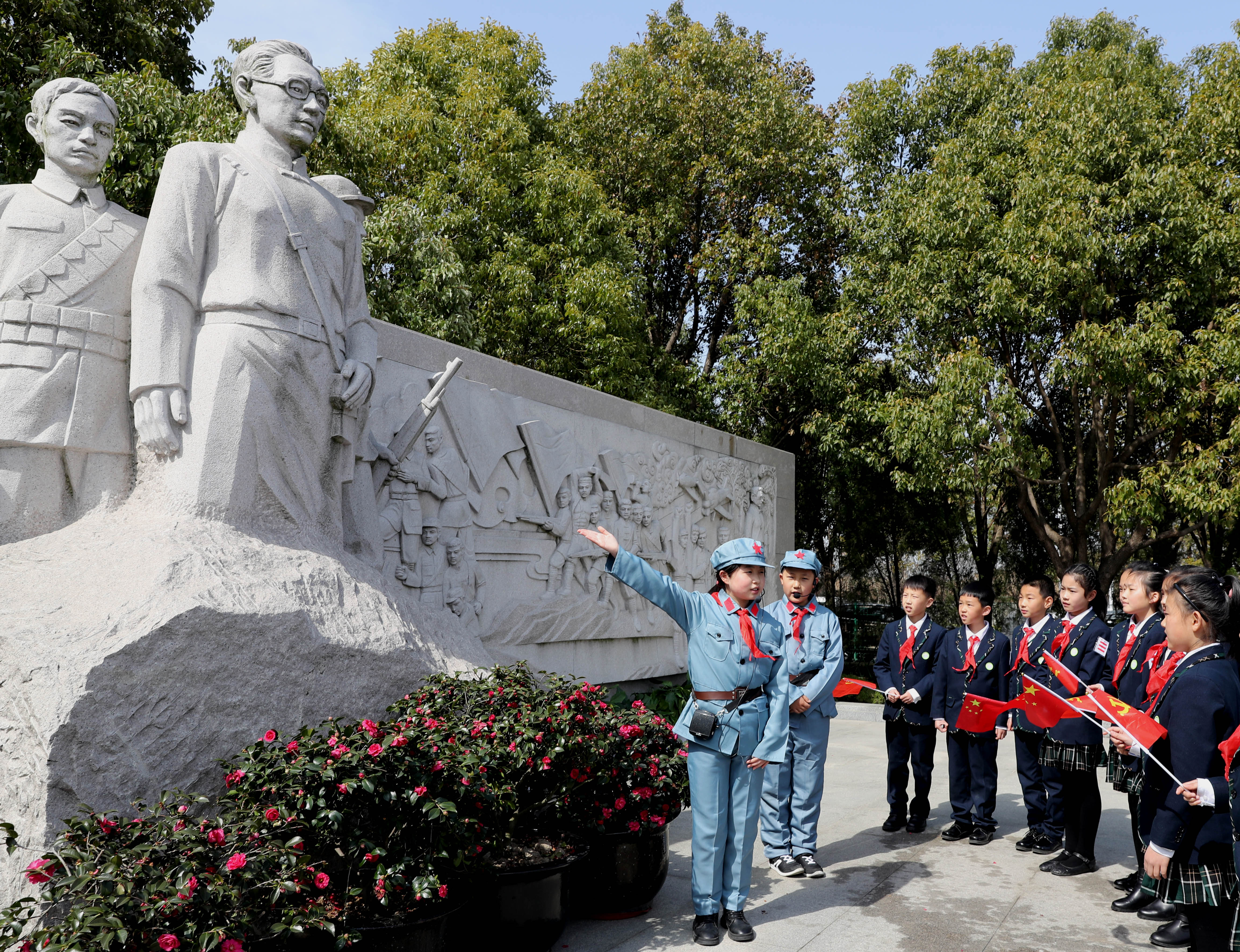 上海市外冈游击队纪念馆的“小小讲解员”带领参加活动的学生代表参观纪念馆(新华社记者刘颖摄)
