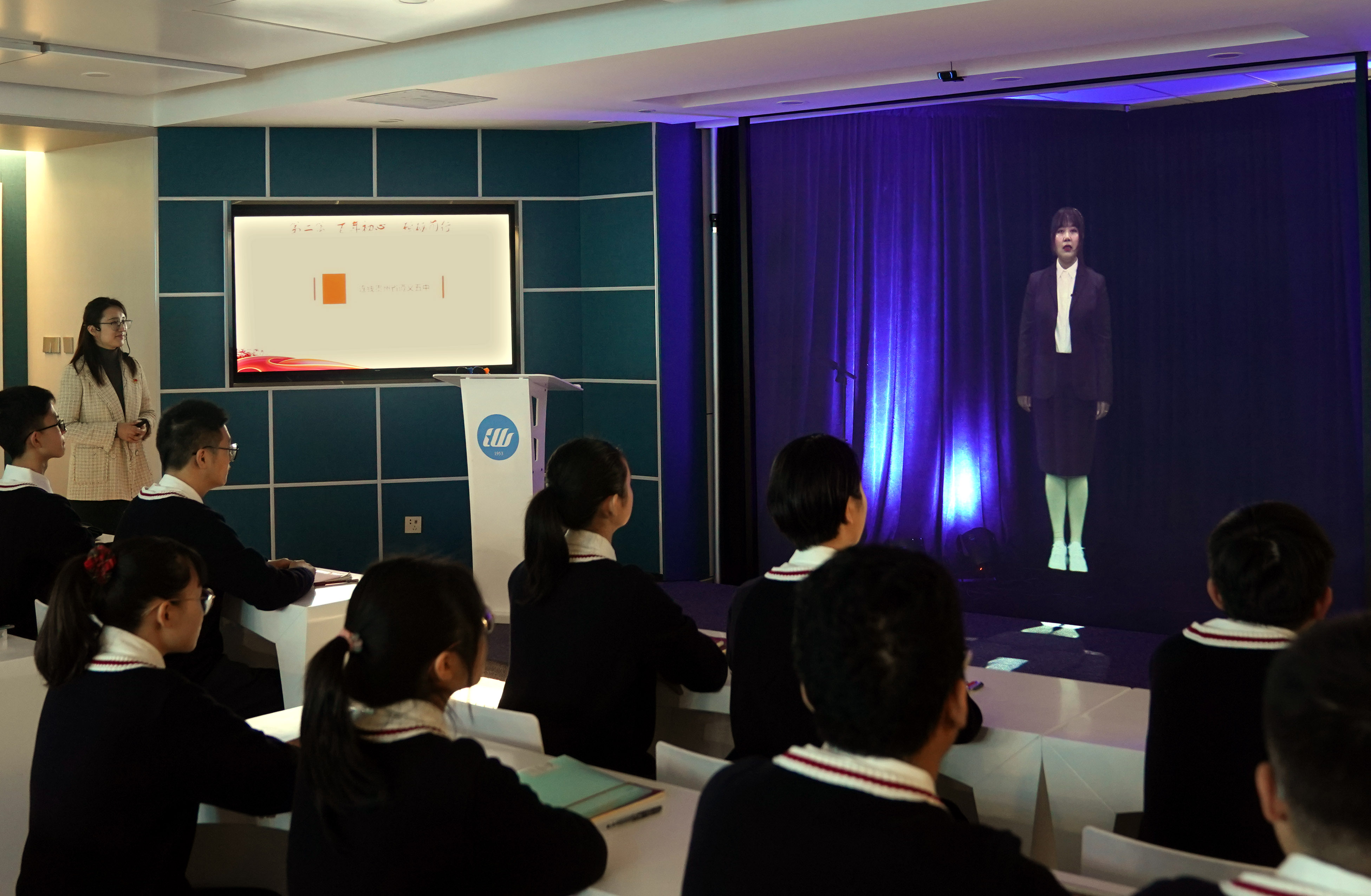 3月18日,在上海市卢湾高级中学5G+全息智慧教室,师生聆听贵州省遵义市第五中学唐艳老师(全息影像)讲述党史故事(新华社记者刘颖摄)