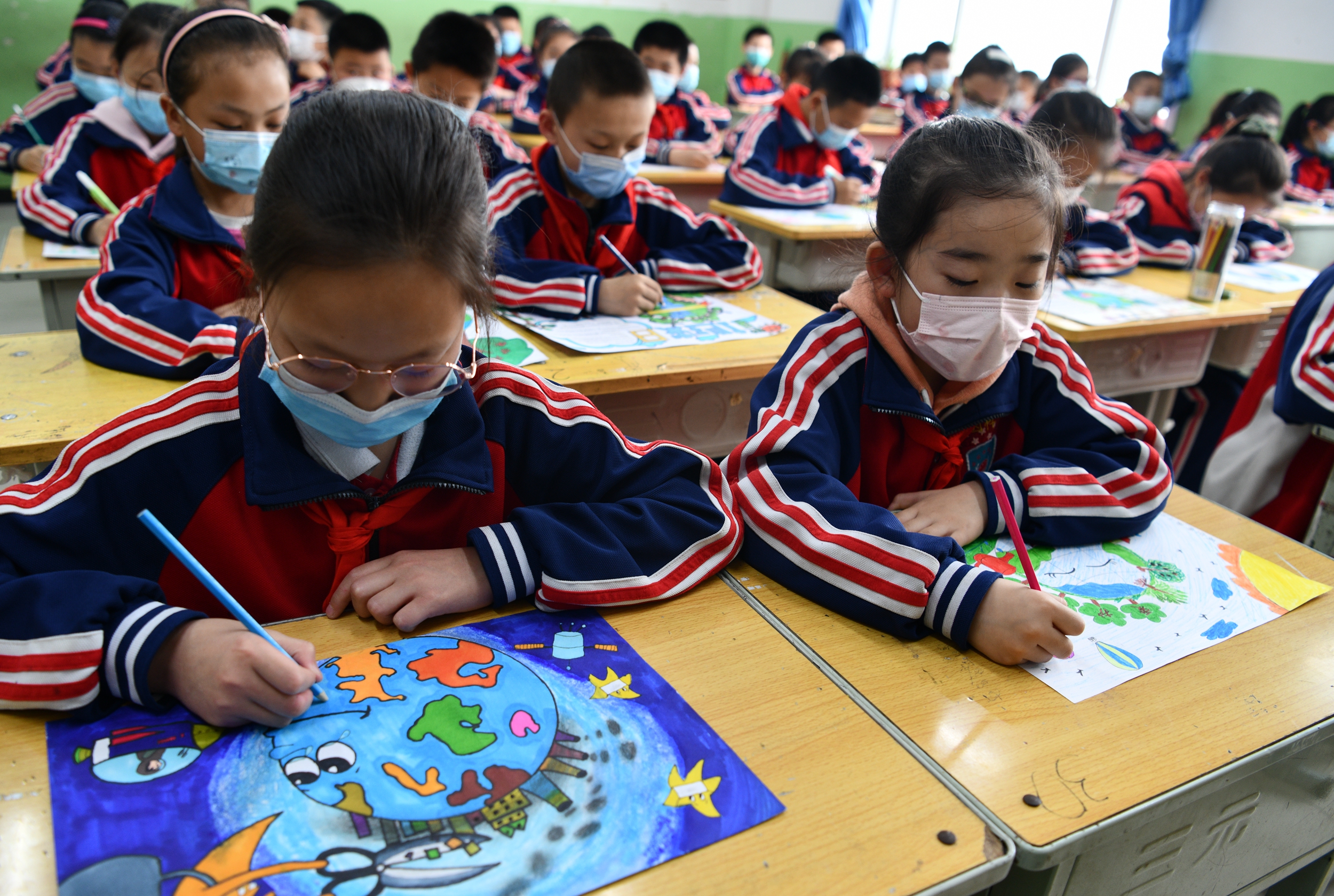 图1:为迎接4月22日“世界地球日”的到来,河北省石家庄市栾城区凌空桥路小学和第一幼儿园开展“环保行动从小做起”主题班会活动,通过向学生讲解环保知识、共同创作环保手工画等形式,增强少年儿童环保意识和时代使命感,做保护地球,保护环境的行动者和倡导者。图为2021年4月21日,河北省石家庄市栾城区凌空桥路小学学生们创作环保手工画。新华网发 李明发摄