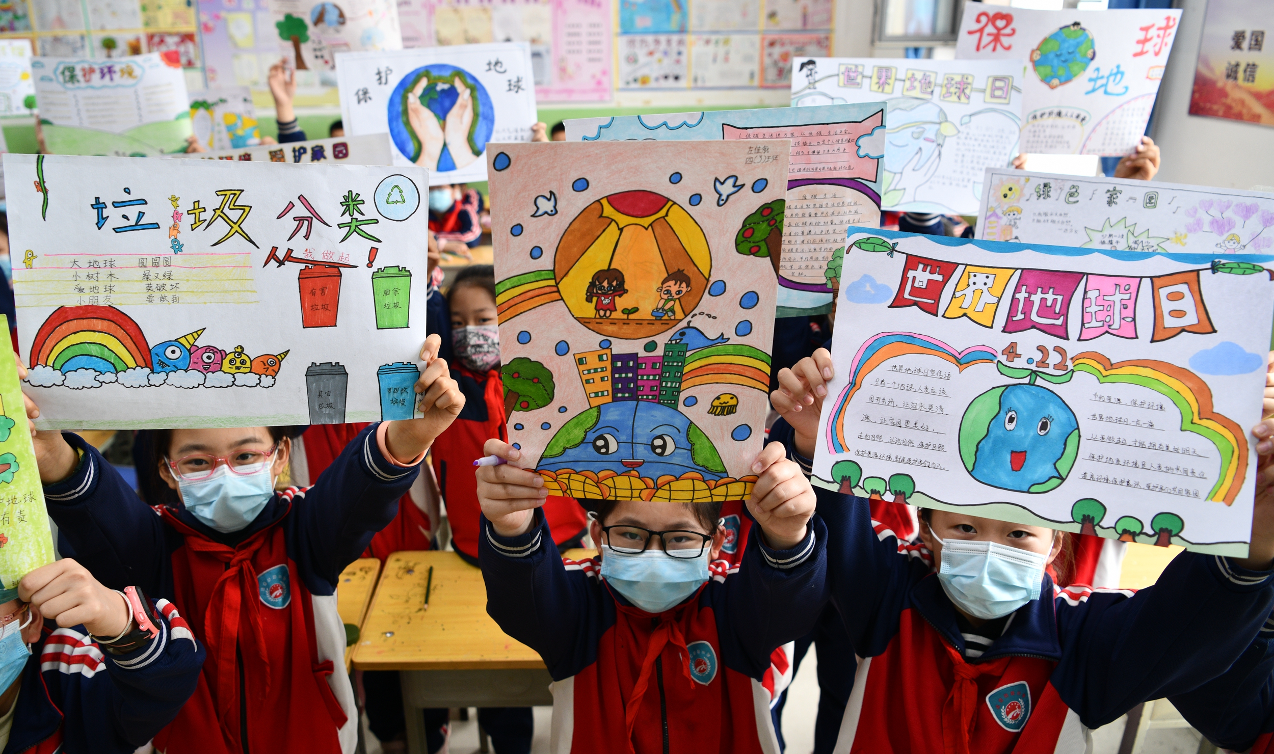 图3:为迎接4月22日“世界地球日”的到来,河北省石家庄市栾城区凌空桥路小学和第一幼儿园开展“环保行动从小做起”主题班会活动,通过向学生讲解环保知识、共同创作环保手工画等形式,增强少年儿童环保意识和时代使命感,做保护地球,保护环境的行动者和倡导者。图为2021年4月21日,河北省石家庄市栾城区凌空桥路小学学生们展示自己创作的环保手工画。新华网发 李明发摄