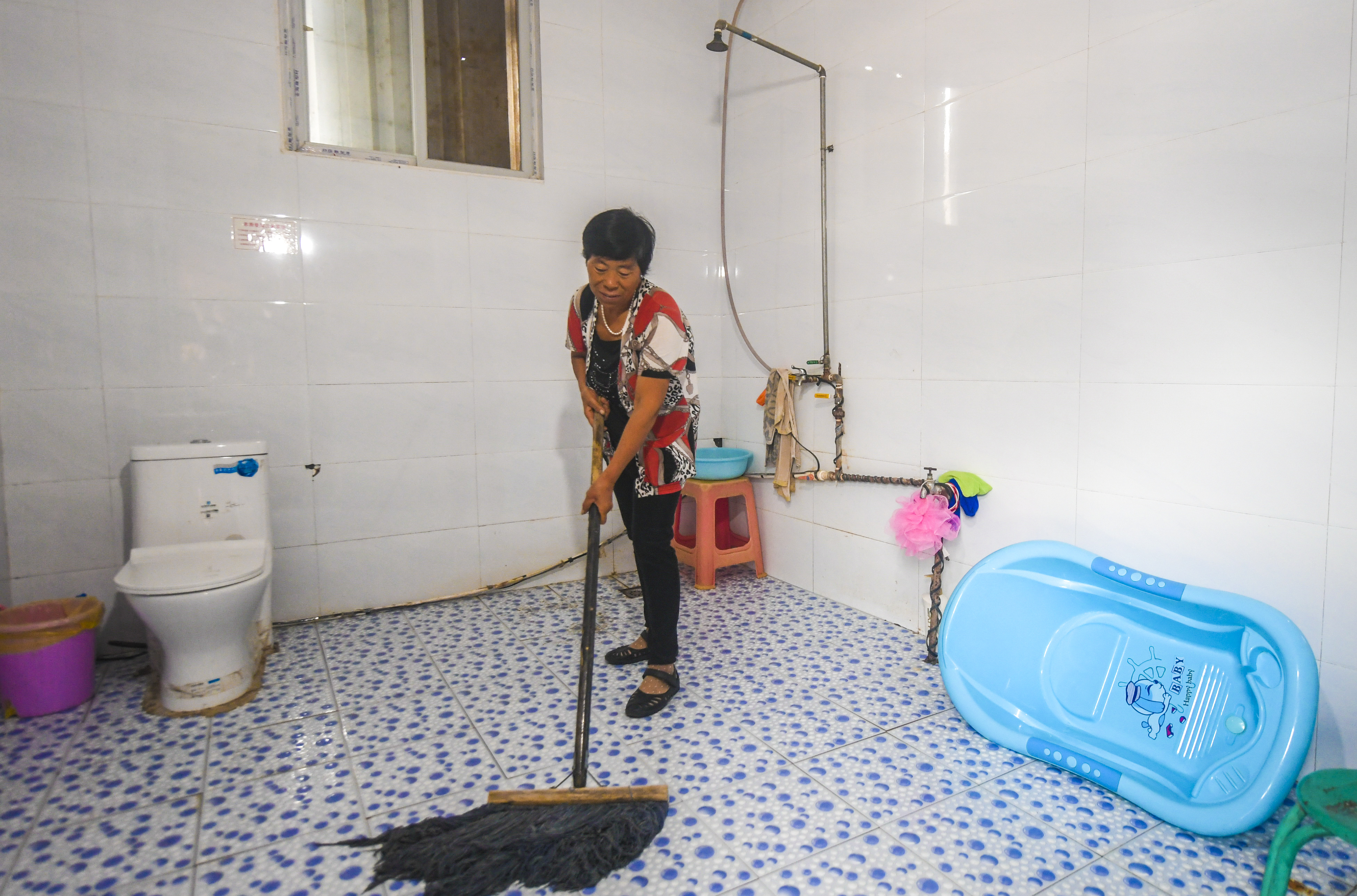 2019年9月10日,河北省永清县三圣口乡第四村村民在自家厕所打扫卫生。新华社记者 李晓果 摄