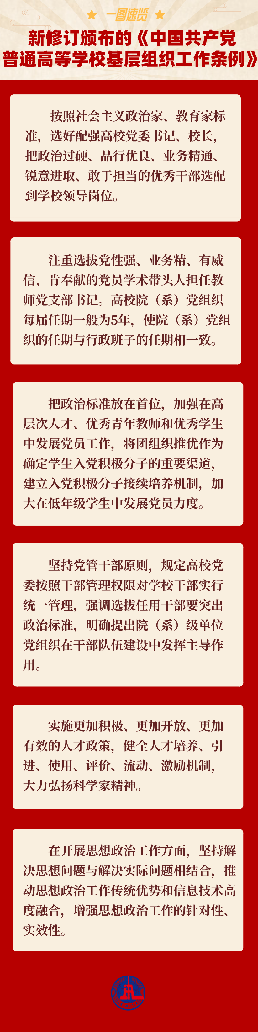 近日,中共中央印发新修订的《中国共产党普通高等学校基层组织工作条例》。条例对高校基层党组织工作作出全面规范,体现了近年来高校党建工作的理论、实践和制度创新成果,是新时代高校党的建设的基本遵循。详情请看↓