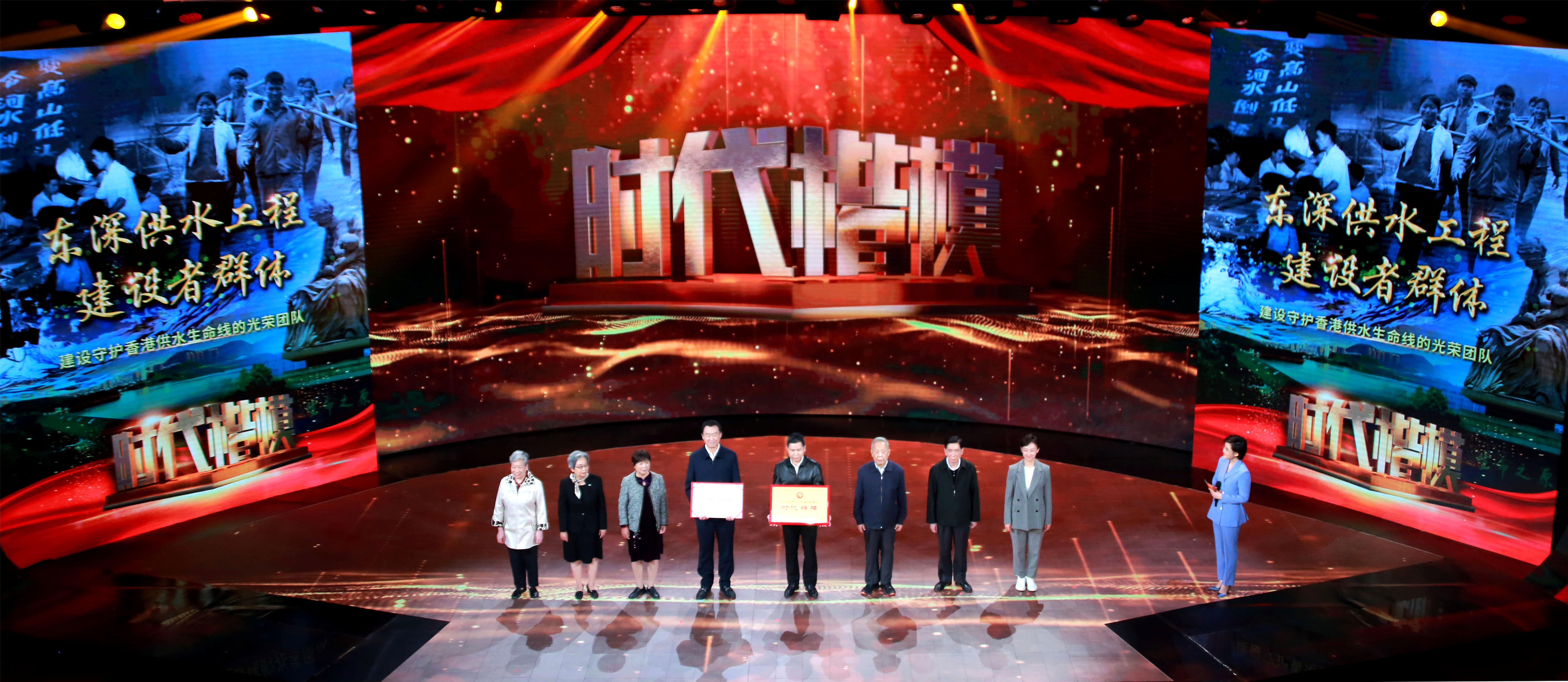 东深供水工程建设者群体代表在“时代楷模”发布仪式上领取“时代楷模”奖牌和证书。新华社记者 潘旭 摄