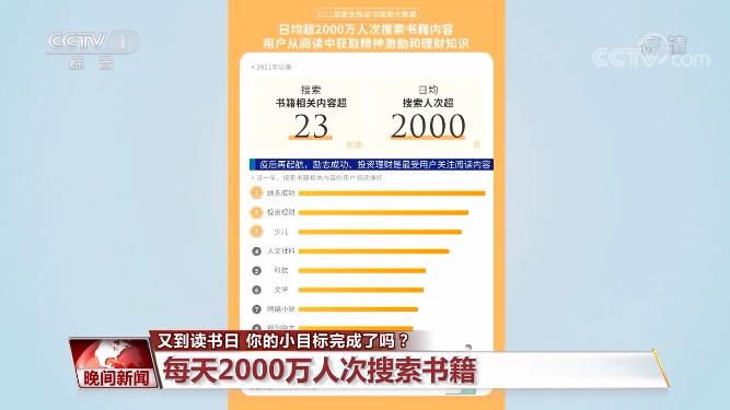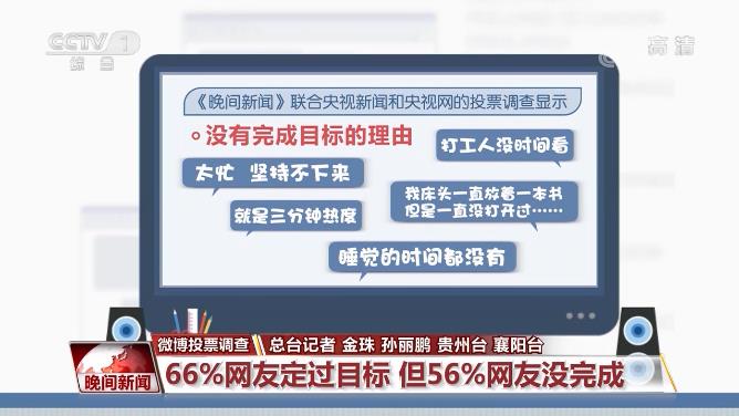 纸质书、电子书、看书、挺熟,读书显然越来越方便。那么,读书的你们,有给自己定个小目标吗?《晚间新闻》联合央视新闻和央视网的投票调查显示,截至今晚8点,有66%的人表示定过目标,但其中56%的人没有完成目标。而没完成的理由则是“太忙,坚持不下来”、“打工人没时间看”、“就是三分钟热度。”“我床头一直放着一本书,但是一直没打开过……”