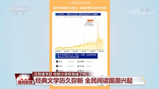 那么,大家都爱看什么书呢?百度搜索大数据显示,《时间简史》、《富爸爸穷爸爸》、《资本论》、《唐诗三百首》分列科普读物、投资理财、社科新知、文学等子榜单的第一。同时,全民阅读潮中蕴含国潮兴起的趋势,《唐诗三百首》搜索热度迎来十年最高,同比上升60%。