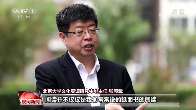 北京大学文化资源研究中心主任 张颐武:阅读并不仅仅是我们常常说的纸质书的阅读,只要我们能够通过有益的阅读来感受到这个文化,触摸到阅读的这些内容就是一个很好的阅读方式。因为我们有了一个手机,就可以天下的书籍会聚到我们小小的手机里面,这个对我们阅读掌握文化,其实具有高度意义。
