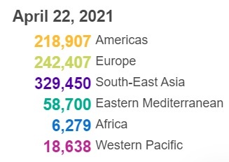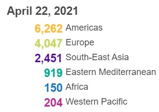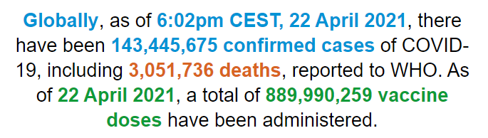 根据世卫组织最新实时统计数据,截至欧洲中部夏令时间4月22日18时02分(北京时间4月23日0时02分),全球累计新冠肺炎确诊病例143445675例,累计死亡病例3051736例。22日全球新冠肺炎确诊病例新增874381例,单日新增病例数量为疫情暴发以来最高,死亡病例新增14033例。