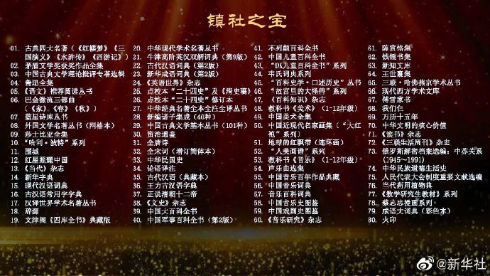中国出版集团4月23日发布80种“镇社之宝”。古典四大名著、《新华字典》、点校本“二十四史”及《清史稿》、外国文学名著丛书(网格本)、《中国大百科全书》《鲁迅全集》《莎士比亚全集》等榜上有名。说说你看过哪些?(记者白瀛、史竞男)
