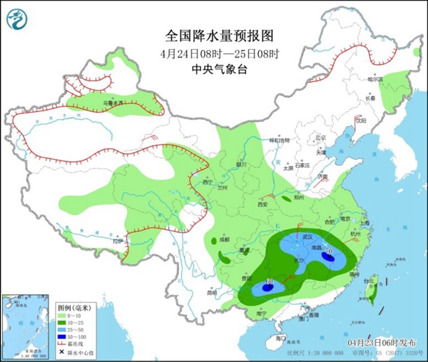 明天,新疆沿天山地区、西藏东部、青海北部等地的部分地区有中到大雪或雨夹雪,其中,青海东北部局地有暴雪;江汉南部、江南大部、贵州东部、广西中北部等地的部分地区有中到大雨,其中,江西中部、广西北部等地局地有暴雨(50~70毫米)。