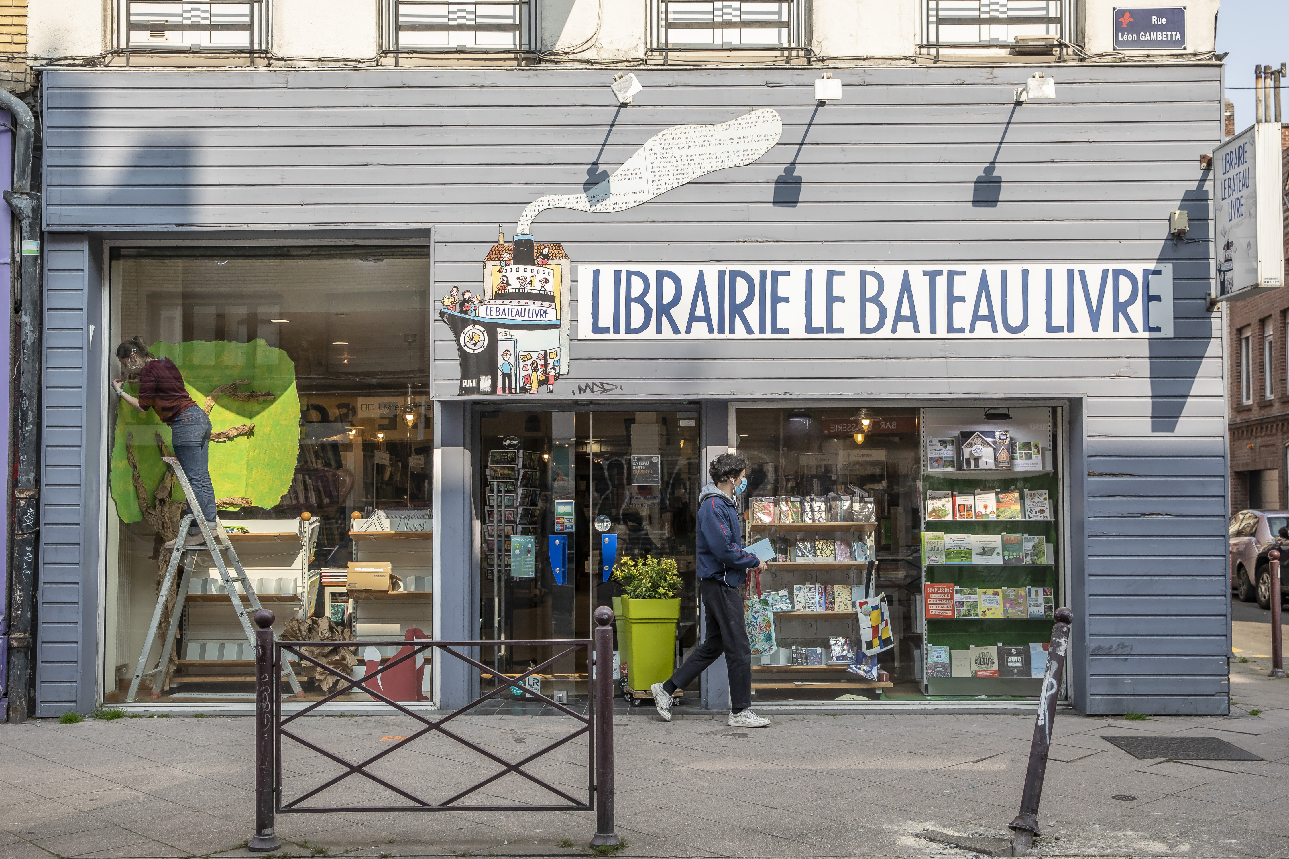 新华社巴黎4月22日电(记者高静 塞巴斯蒂安·库尔吉)法国北部城市里尔一条安静的小街上,坐落着一家名为“书舟”的小书店。店面不大,具有工业风的简约外观。青灰色墙面上用孩童般稚嫩的笔触画着一条大船,烟囱冒着长篇累牍的文字。船上乘客人手一本书,唯一一位没有拿书的,叉腰站在船舱门前,迎来送往。这位亲切又滑稽的“船长”就是书店的主人——冈萨格·斯蒂吉斯特。