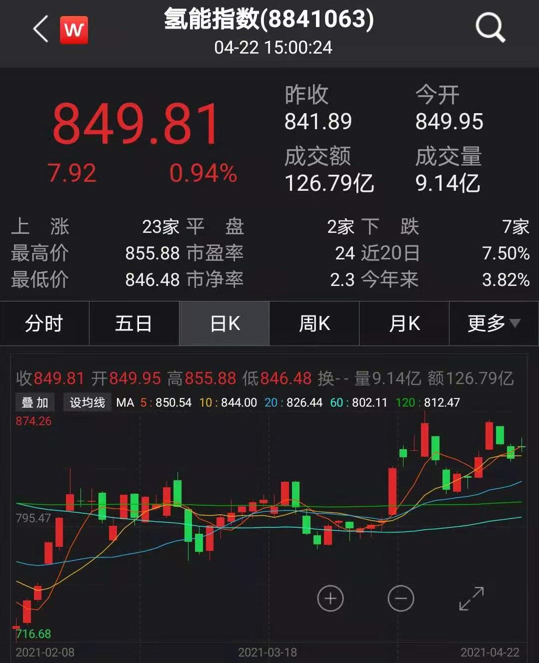 A股氢能板块近期也重现上涨行情。4月22日,氢能指数涨0.94%,成分股中动力源涨停,安泰科技、贵研铂业、汉钟精机、金龙汽车、南都电源等跟涨。2月8日以来,氢能指数累计上涨16.83%。