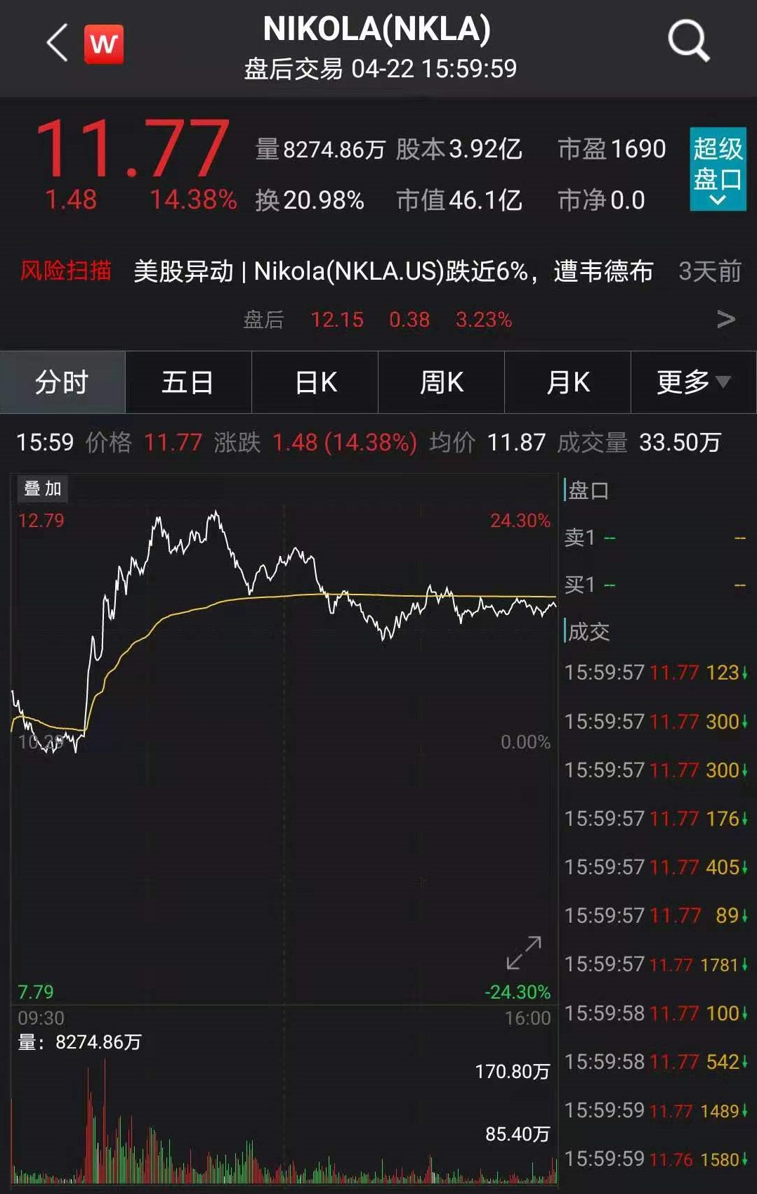 4月22日美股开盘后不久,Nikola直线冲高,最高升至每股12.79美元。截至收盘,Nikola涨幅回落至14.38%,每股报11.77美元。