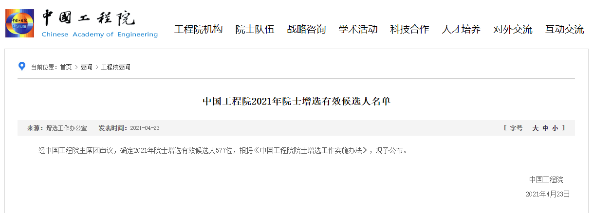 4月23日,中国工程院在其官网公布了2021年院士增选有效候选人名单。经中国工程院主席团审议,此次共确定2021年院士增选有效候选人577位>>详情。此前,贵州省科协院士增选拟推荐对象、茅台集团总工程师王莉不在其中。