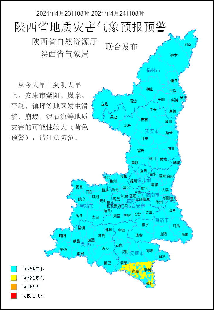 陕西省自然资源厅与陕西省气象局今天(4月23日)上午联合发布地质灾害气象黄色预警。预计4月23日8时—24日8时,陕西省安康市紫阳、岚皋、平利、镇坪等地区发生滑坡、崩塌、泥石流等地质灾害的可能性较大,请注意防范。