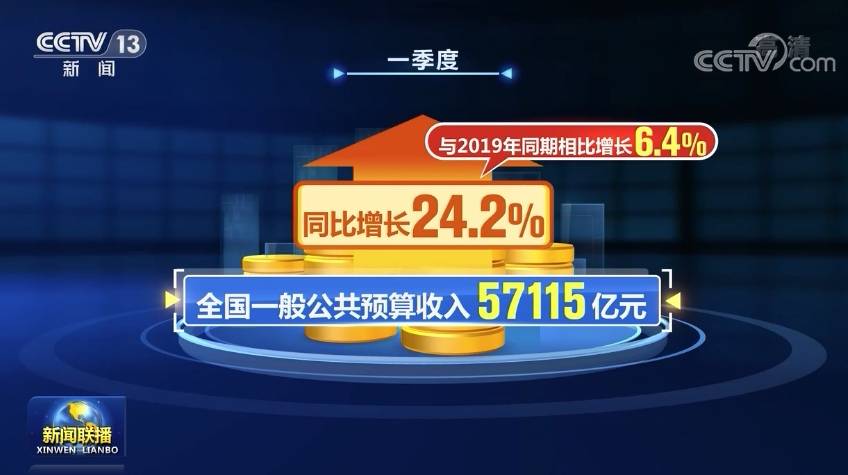 央视网消息(新闻联播):财政部最新数据显示,今年一季度,全国一般公共预算收入57115亿元,同比增长24.2%,与2019年同期相比增长6.4%。