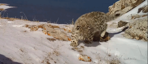 近日,青海省原上草自然保护中心工作人员在收集布设在三江源国家公园黄河源园区的红外线相机时,发现了一组雪豹幼崽成长的高清活动影像。一只小雪豹被雪地上的石块吸引,很认真的和石块玩耍了起来,萌态十足。一周后同一部红外相机在一个风雪交加的夜晚再次拍到雪豹妈妈和两只小雪豹,两只小雪豹无惧风雪互相打闹追逐。来年夏天,这两只萌萌的小雪豹已经成长为体型健硕的亚成体。