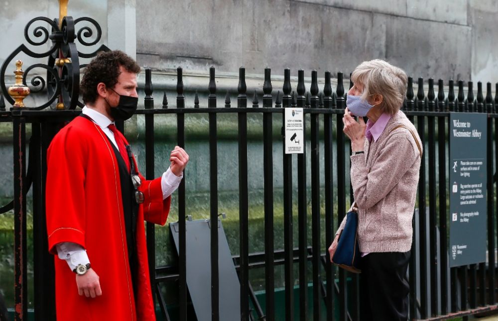 3月31日,一名戴口罩的女子在位于英国伦敦威斯敏斯特教堂的新冠疫苗接种中心外与工作人员交谈。新华社记者韩岩摄