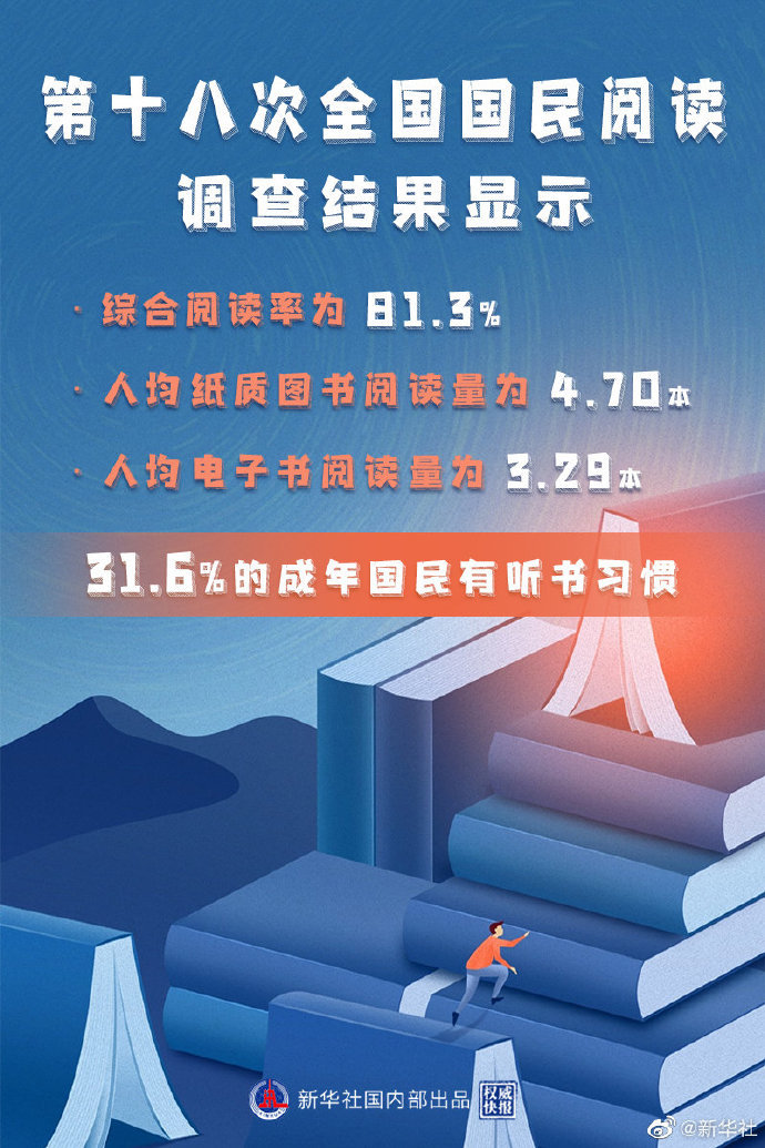 第十八次全国国民阅读调查结果23日在京发布。2020年,我国成年国民包括书报刊和数字出版物在内的各种媒介综合阅读率为81.3%,人均纸质图书阅读量为4.70本,人均电子书阅读量为3.29本。今天恰逢世界读书日,你去年的阅读量达标了吗?(记者:王鹏、史竞男,海报设计:肖循)
