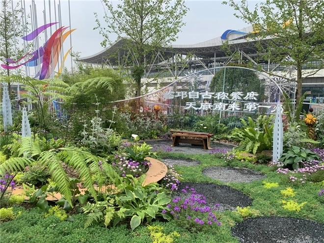 因邛崃地貌多元,山峻景美,所以整个展园采用多种蕨类植物的方式营造出一种自然生态的感觉,将邛崃的山水特征一一体现,表达了邛崃对未来人文与自然和谐共处的理念,再现了“临邛自古称繁庶,天府南来第一州”的胜境。
