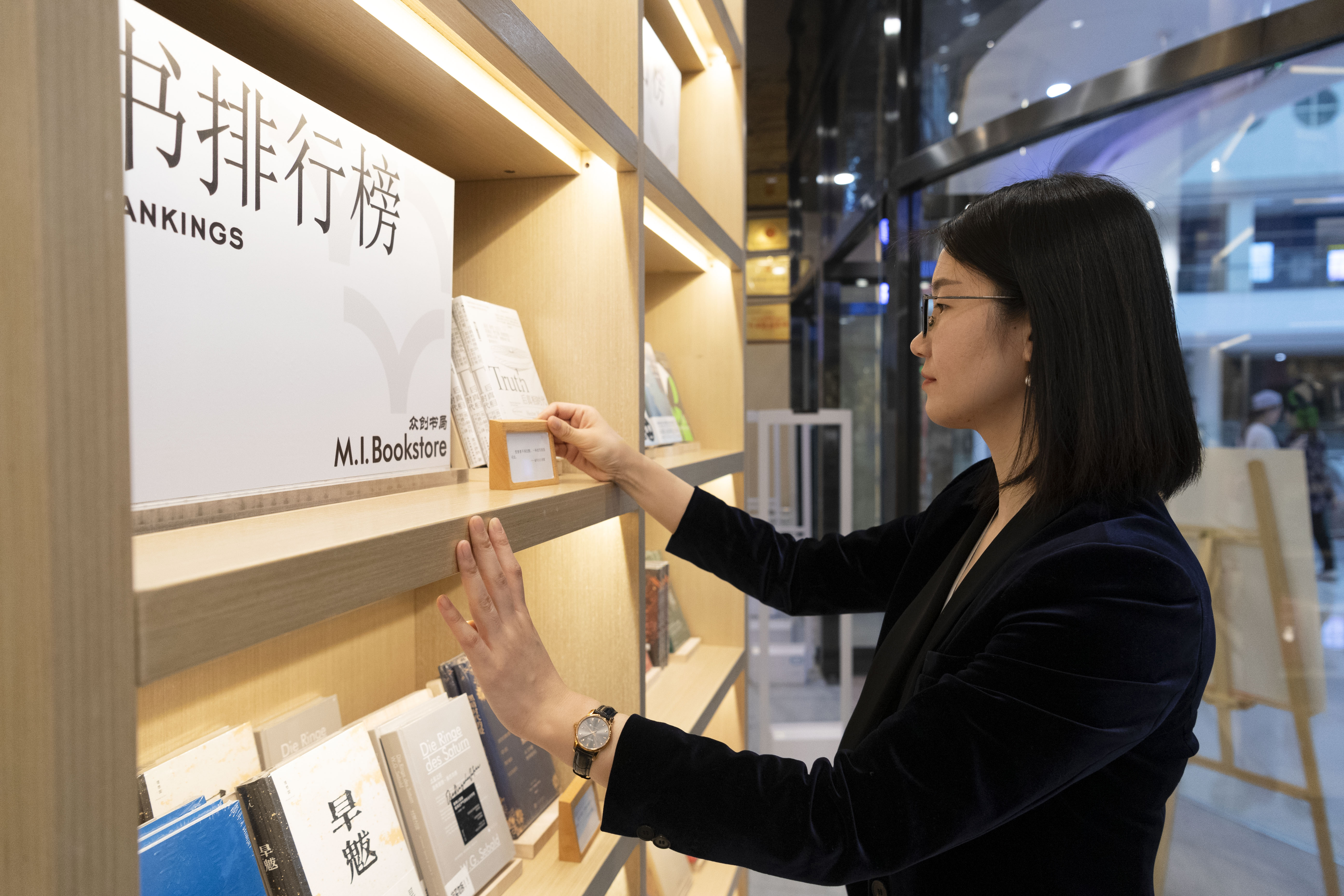 在书店入口处,有着一头利落短发、戴着黑框眼镜的于冰在忙着整理销售数据,更新新书排行榜。