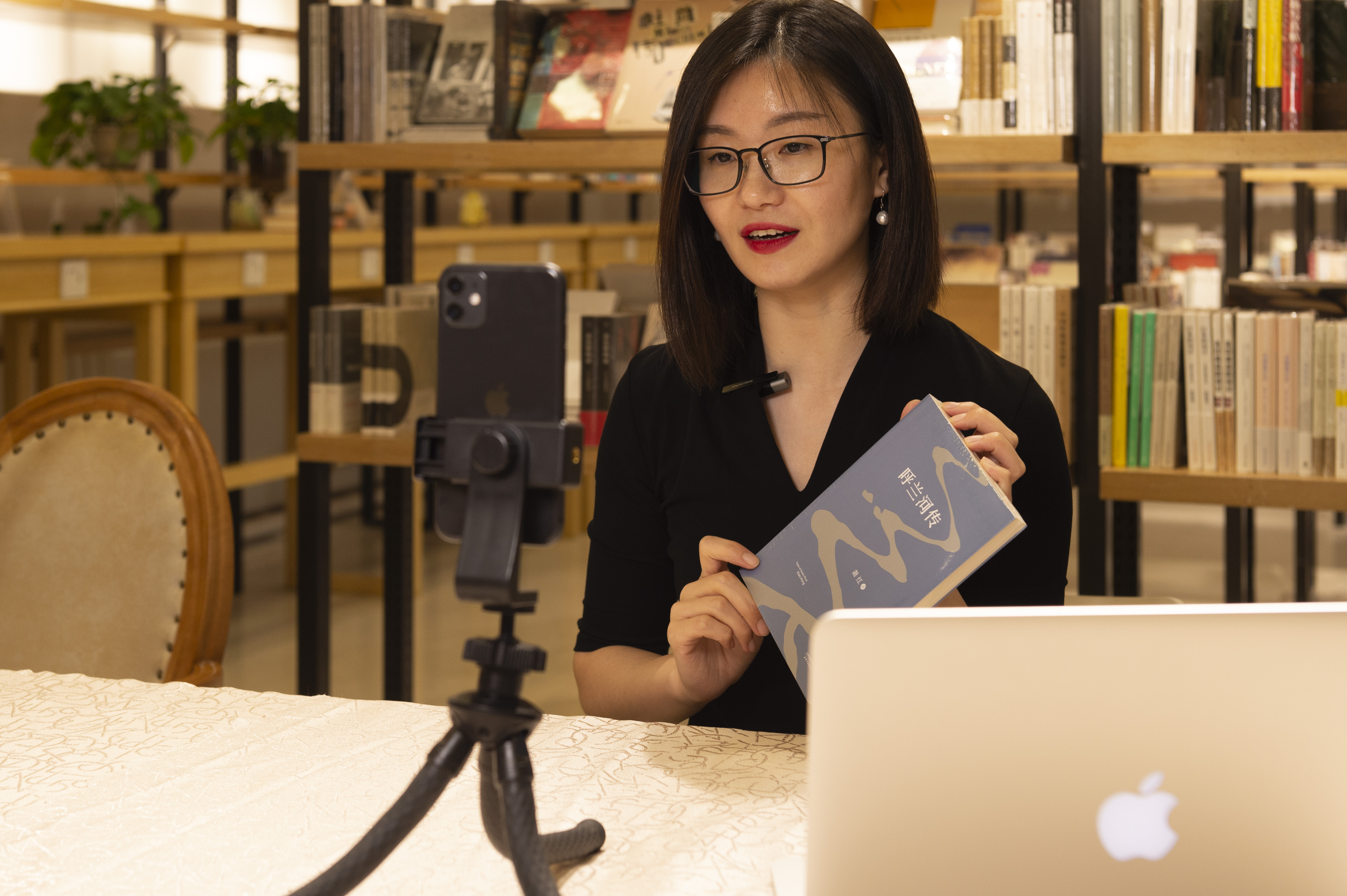 于冰在录制图书推荐短视频,推荐作家萧红的作品《呼兰河传》(新华社记者谢剑飞 摄)