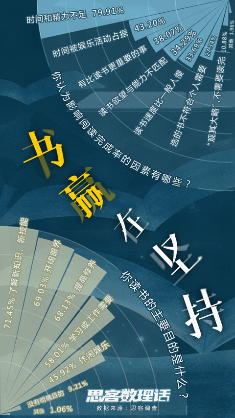 想读书,但多数受访者表示心有余而力不足。79.91%的受访者认为,读书的时间和精力不足,影响阅读完成率。有受访者说,“下班回家还要做饭看孩子,没时间念书”“阅读要动脑子,但有时候累了脑子就不转了”。