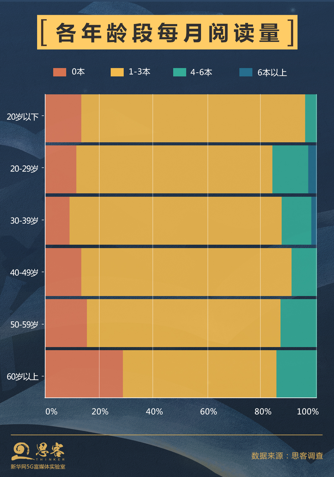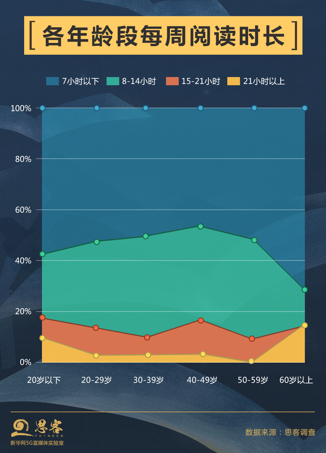 51%的受访者平均每天阅读时长低于1小时。30-60岁的中年阅读群体,平均每天阅读时长在1-2个小时的比例较高。