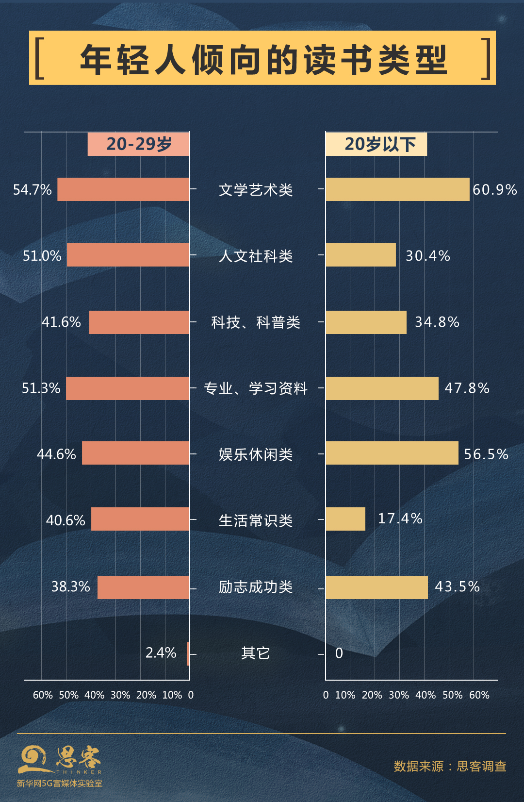 年轻人有着较为集中的阅读方向。思客调查显示,20-29岁年龄段受访者,更偏好文学艺术类、人文社科类、专业学习资料书籍。20岁以下的受访者中,文学艺术类、娱乐休闲类、专业学习类资料书籍更受青睐。