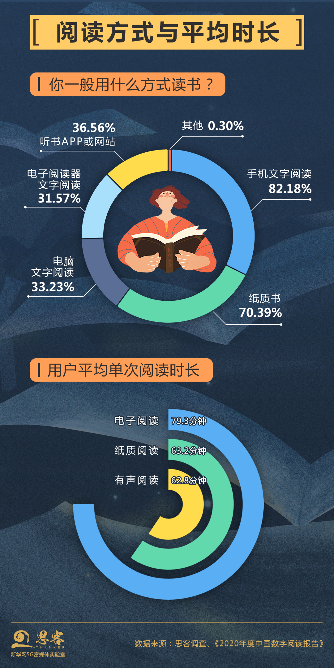 从“一卷在手”到“一屏万卷”,电子阅读成为很多人的首选。调查显示,82.18%的受访者选择用手机读书,70.39%的受访者会读纸质书,有声书阅读的比例则超过三成。《2020年度中国数字阅读报告》显示,2020年人均电子书阅读量9.1本,人均有声书阅读量6.3本。人均纸质书阅读量6.2本,比2019年减少2.6本。2020年电子阅读付费用户中26.8%的人每月平均花费100元及以上,越来越多的用户愿意为高质量内容买单。