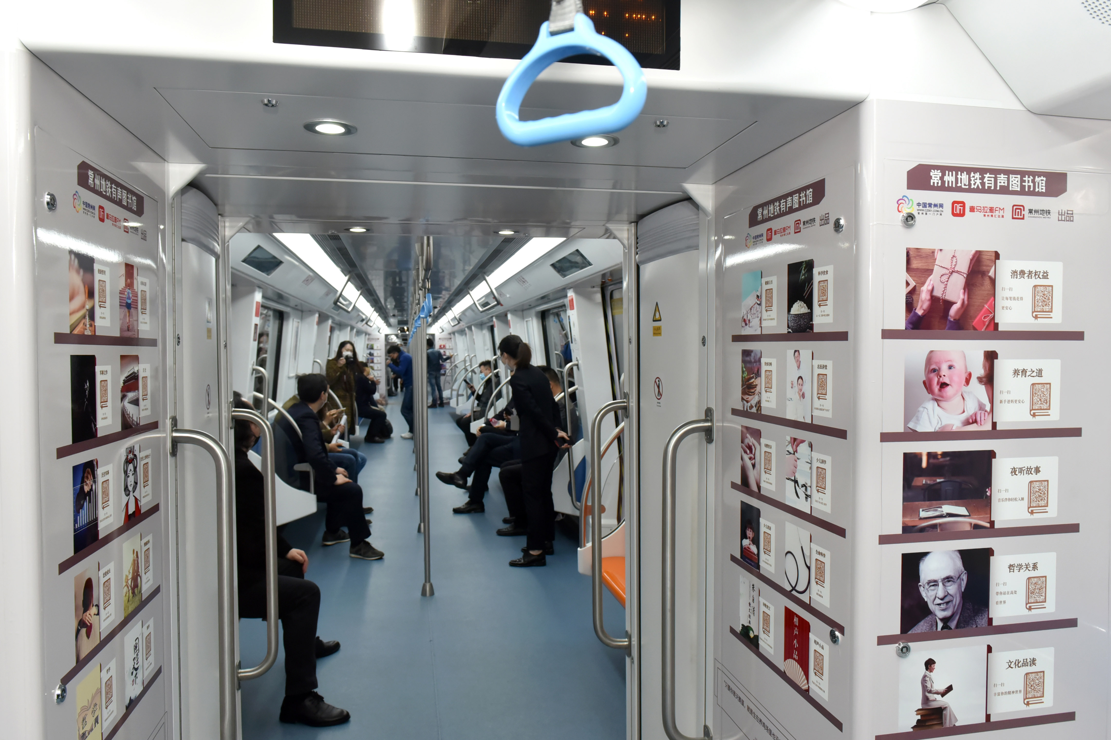 4月21日,“书香常州号”地铁专列,乘客只需扫描二维码,即可听书。新华社发(胡平摄)