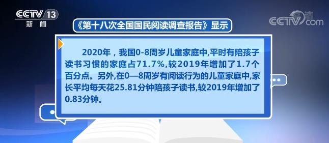 报告显示,2020年,我国0—8周岁儿童家庭中,平时有陪孩子读书习惯的家庭占71.7%。家长平均每天花25.81分钟陪孩子读书,较2019年的24.98分钟增加了0.83分钟。