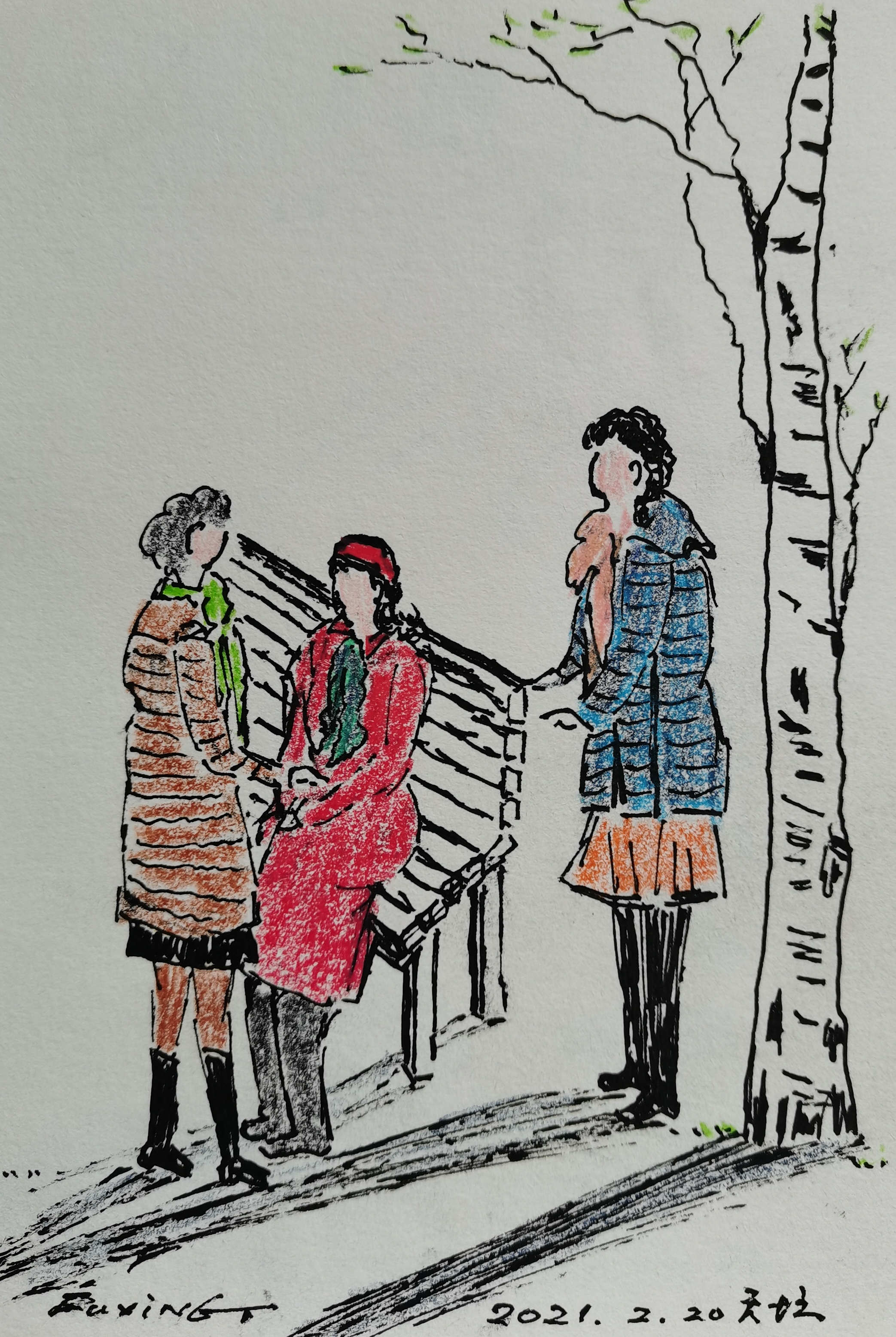 我注意打量了一下,年龄四十多,坐着的那位稍微大一点儿,脸色有些惨白,偏偏穿着最艳的红色大衣。站着的两位亭亭玉立,神情活泼,正从包里拿出小吃饮料,递给坐着的那位。她们的鲜艳衣着吸引了我,赶紧掏出纸笔,画她们的速写。